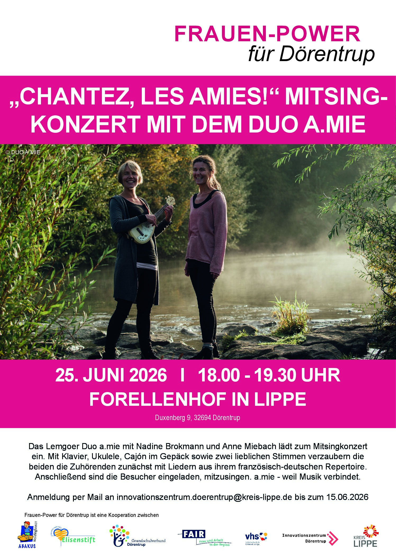 Forellenhof Lippe Duxenberg 9, DörentrupDas Lemgoer Duo a.mie mit Nadine Brokmann und Anne Miebach lädt zum Mitsingkonzert ein. Mit Klavier, Ukulele, Cajón im Gepäck sowie zwei lieblichen Stimmen verzaubern die beiden die Zuhörenden zunächst mit Liedern aus ihrem französisch-deutschen Repertoire. Anschließend sind die Besucher eingeladen, mitzusingen. a.mie - weil Musik verbindet. Anmeldung per Mail an innovationszentrum.doerentrup@kreis-lippe.de bis zum 15.06.2026 […]