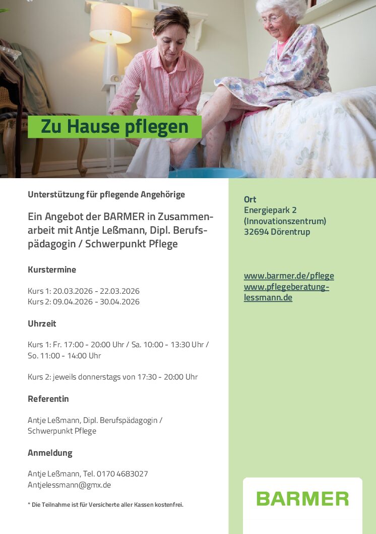 Innovationszentrum Dörentrup Ecke Vossheider Str. / Donoper Str., Dörentrup, DeutschlandUnterstützung für pflegende Angehörige Ein Angebot der BARMER in Zusammenarbeit mit Antje Leßmann, Dipl. Berufspädagogin / Schwerpunkt Pflege Kurstermine Kurs 1: 20.03.2026 - 22.03.2026 Kurs 2: 09.04.2026 - 30.04.2026 Uhrzeit Kurs 1: Fr. 17:00 - 20:00 Uhr / Sa. 10:00 - 13:30 Uhr / So. 11:00 - 14:00 Uhr Kurs 2: jeweils donnerstags von […]